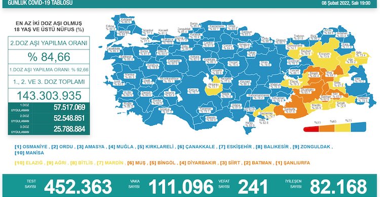Sağlık Bakanı Fahrettin Koca’nın paylaştığı günlük Covid-19 tablosundaki verilere göre, son 24 saatte 452 bin 363 test yapıldı ve 111 bin 96 yeni vaka tespit edildi. Can kaybı 241 kişi olarak istatistiklere yansıdı. İyileşen hasta sayısı ise 82 bin 168 oldu.